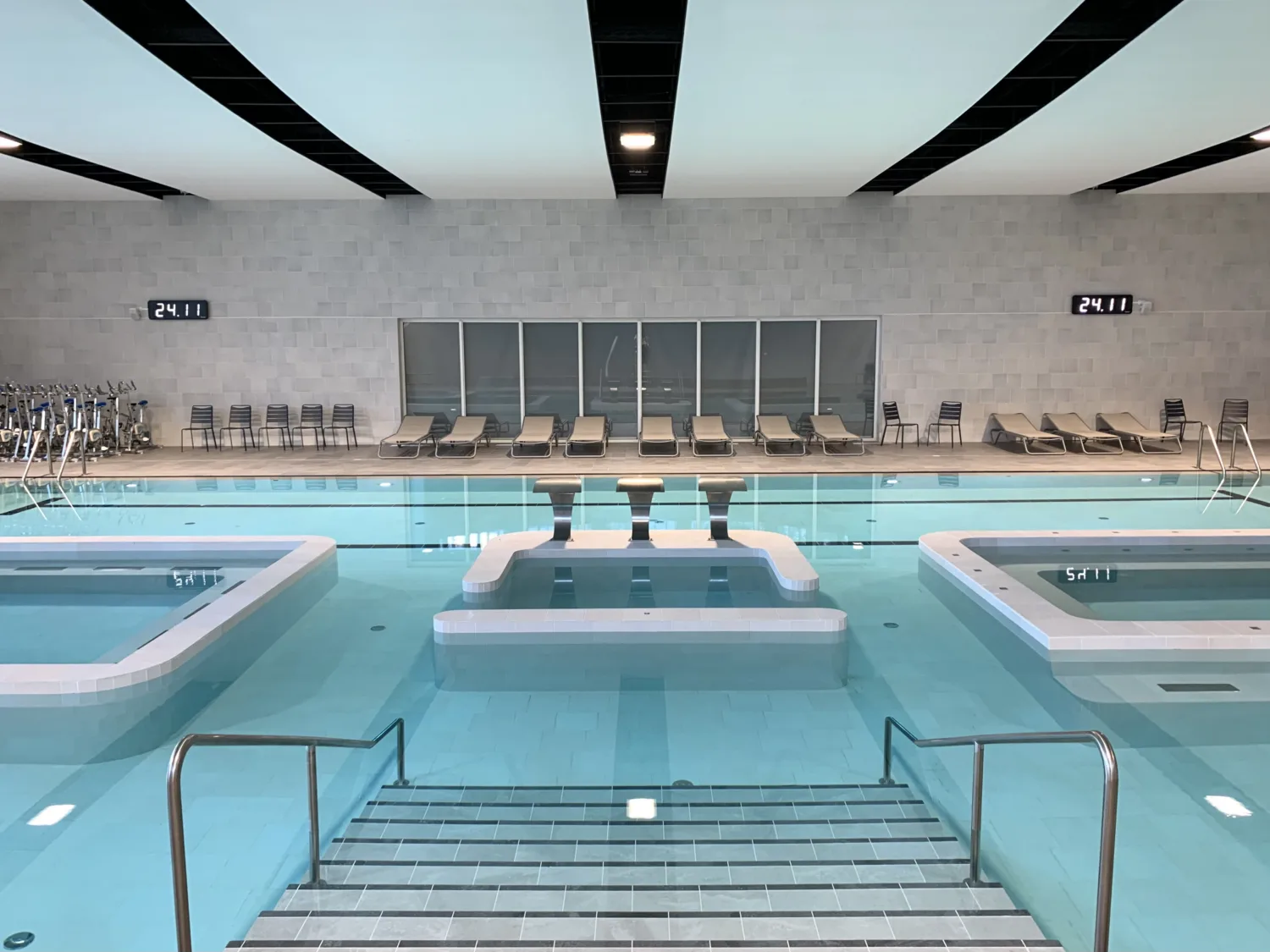 - Indoor swimming pool with water cascades, submerged benches, and massage jets.