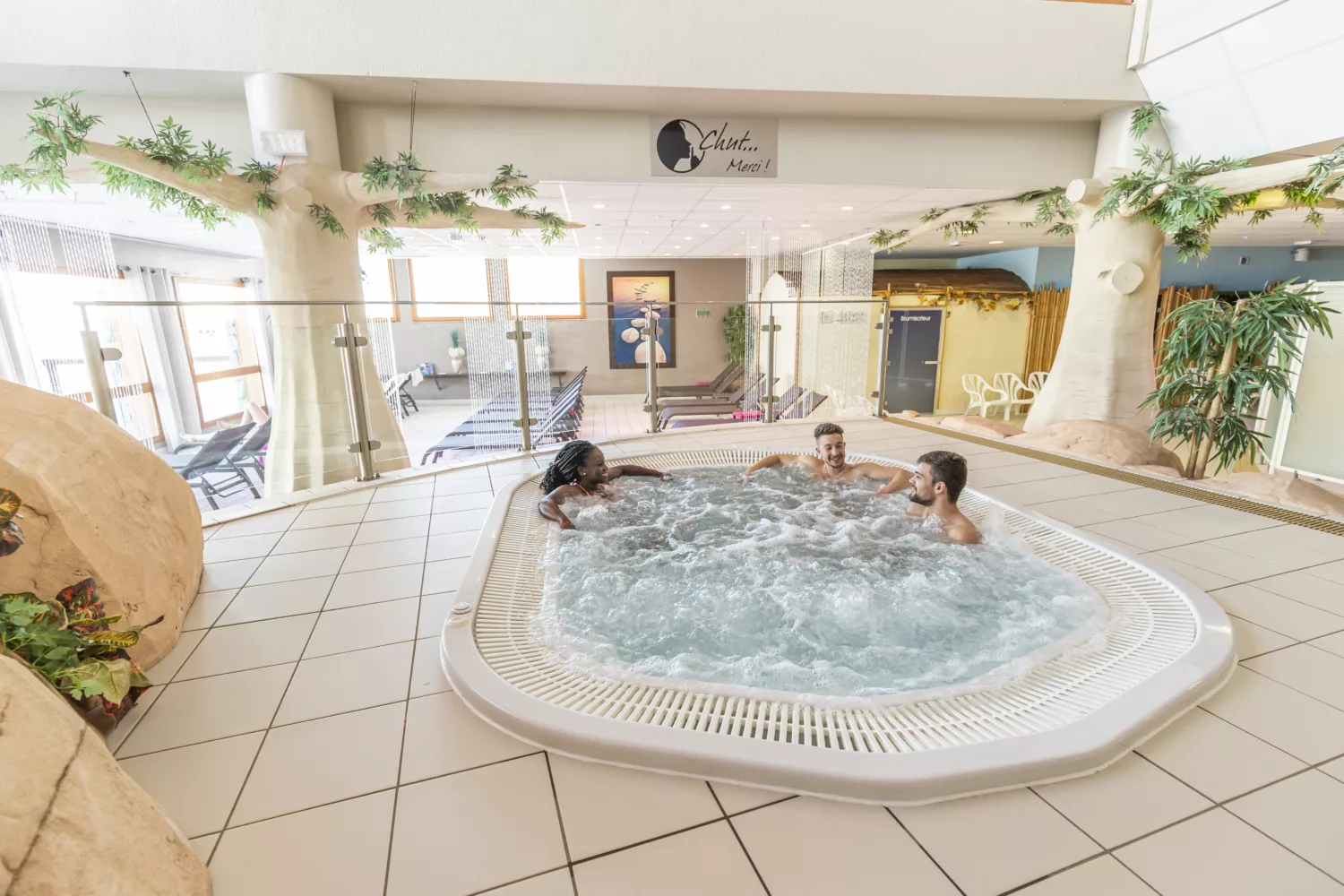 - Piscine intérieure avec cascades d’eau et banquettes immergées